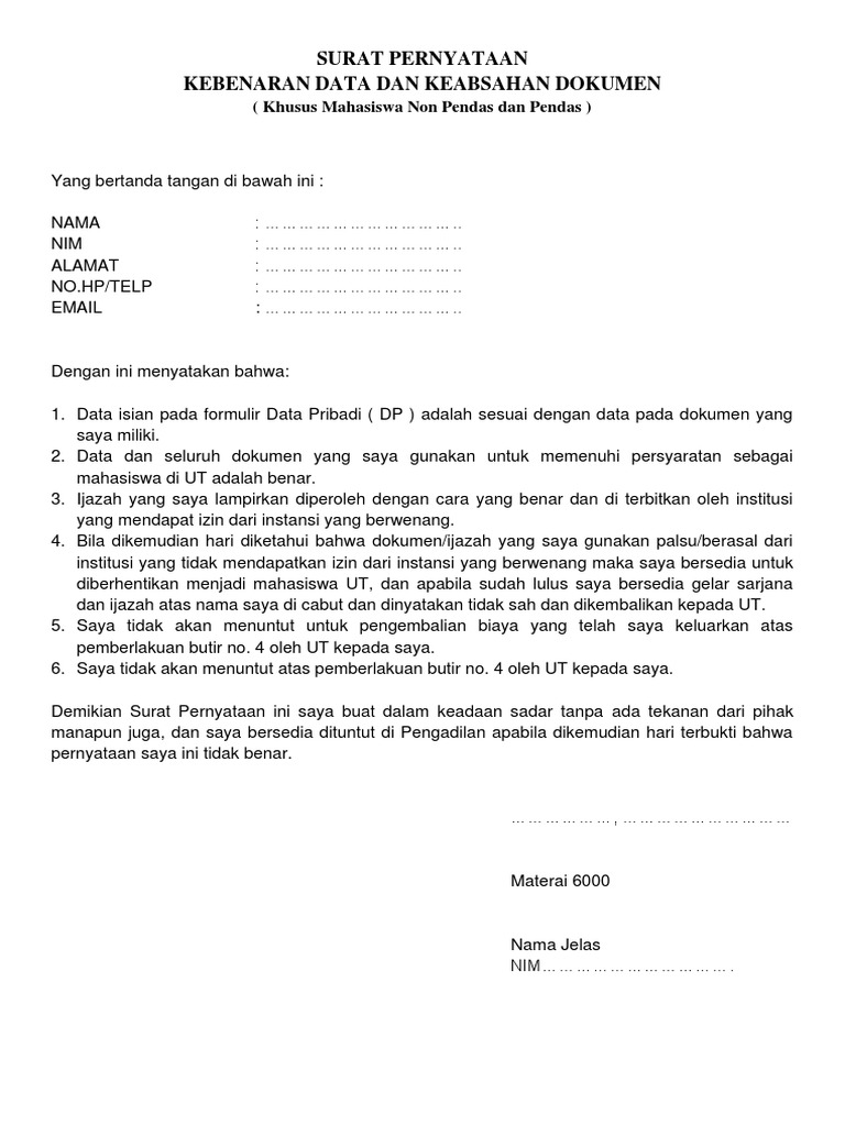 Surat Pernyataan Keabsahan Dokumen Ut 2021 : 1 : Lampiran iv b surat pernyataan keabsyahan karya ilmiah :. Semua contoh ini ada karena kebutuhan akan surat ini memang besar. Demikian pernyataan ini saya buat dengan sebenarnya dan penuh rasa tanggung jawab. Kbri seoul universitas terbuka ut korea selatan facebook : Semua isi dari surat pernyataan tersebut harus bisa dipertanggung jawabkan tanpa terkecuali, agar bisa memperoleh kepercayaan dari pihak ketiga. Surat pernyataann kebenaran data dan keabsahan dokumen author: